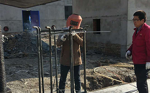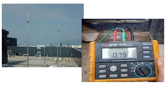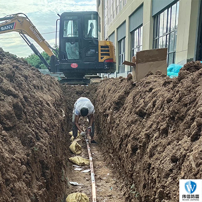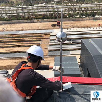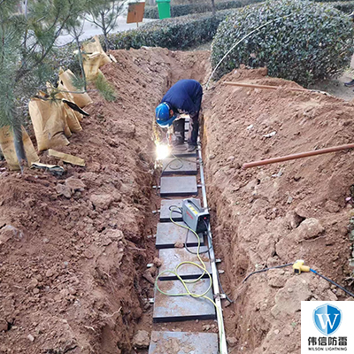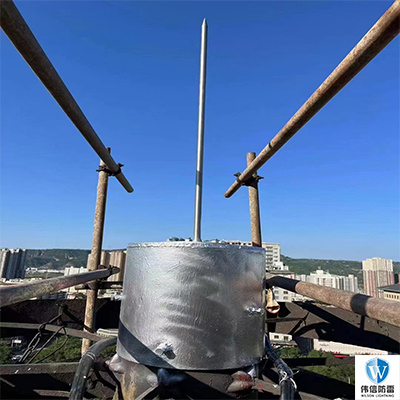 避雷針若定位在地面,則將焊接成形的基礎預埋件垂直置于1200×1200×1000mm規格土坑的正中央,至少有兩點于180度方向與引下線作可靠電氣連接,各焊接點符合規范要求;若避雷針定位在大樓頂…